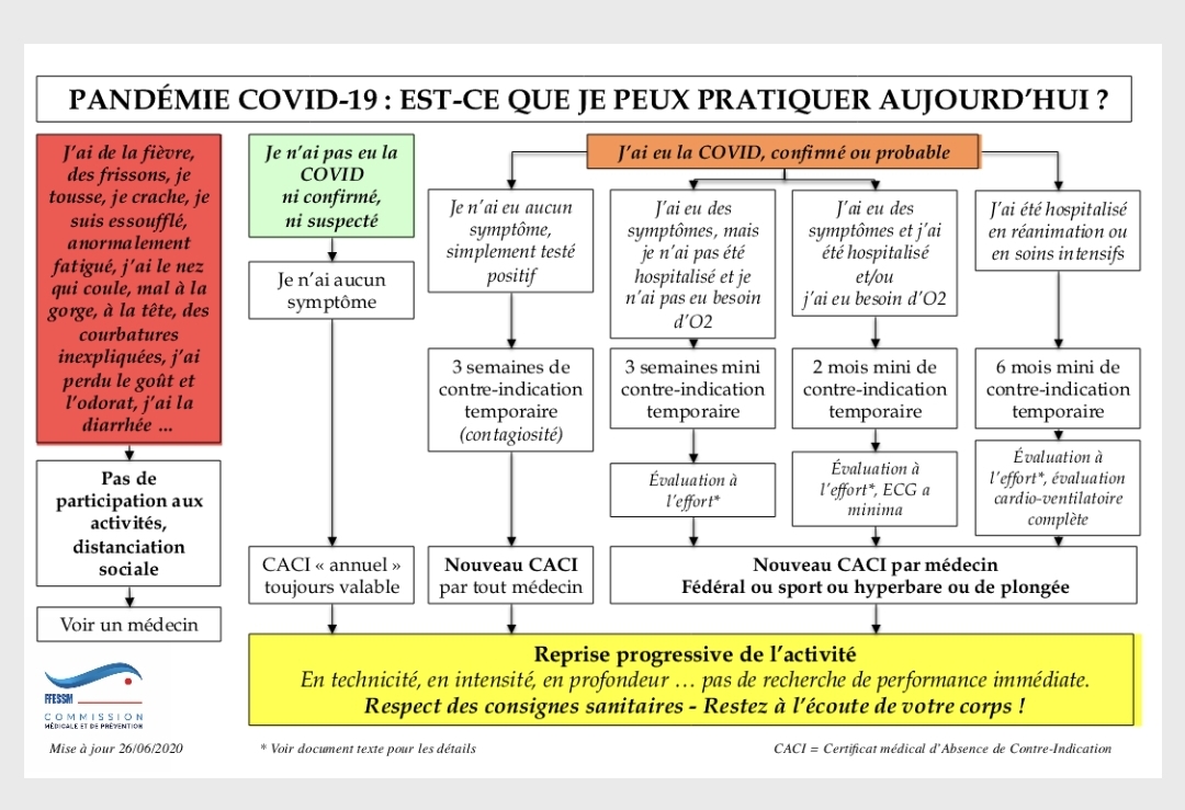 Télécharger l'image jpegCe document clarifie la conduite à tenir lorsque vous reprenez les plongées, selon votre statut vis à vis du virus.